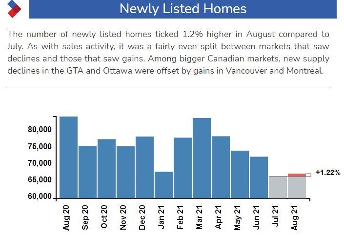 卡斯卡特在上一份报告中曾表示,今年3月份时出现的市场活动水平属于“不可持续”,此后出现放缓确在情理之中,但市场并未正常化,高需求和低供应之间的矛盾不但未缓和反而还更严重。不过加拿大全国8月份新挂牌上市的房屋数量比7月份略有增加,增加幅度是1.2%(7月份月环比减少8.8%)。