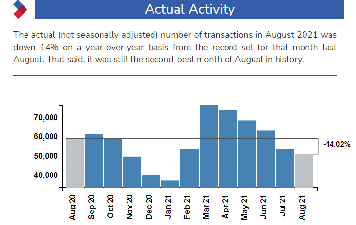 8月的房屋实际成交量(未经季节性调整)与创历史最高当月记录的去年8月相比,同比减少了14%,但尽管如此今年8月仍有历史第二高的实际成交量。