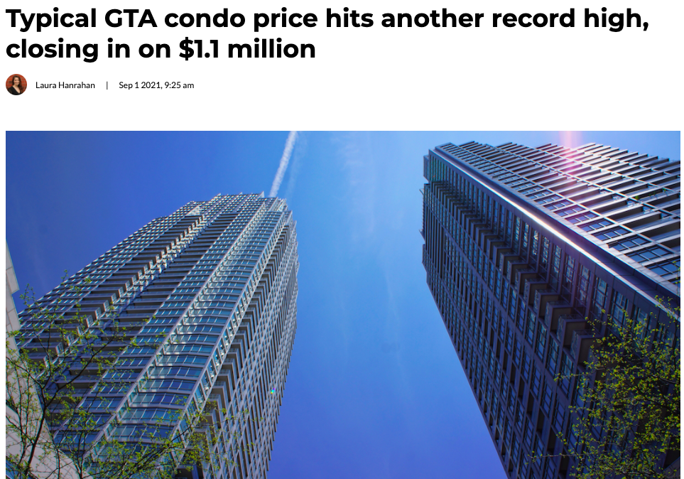 另据Altus Group的报告称,大多伦多地区7月份新建Condo的平均价格达到每平方英尺$1,141 元,不仅同比上涨9.8%,而且创下历史最高纪录。