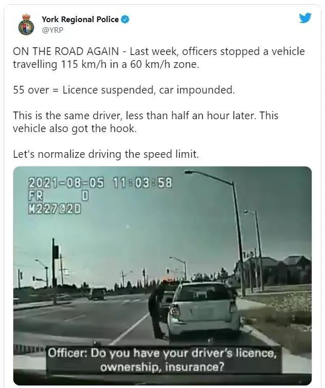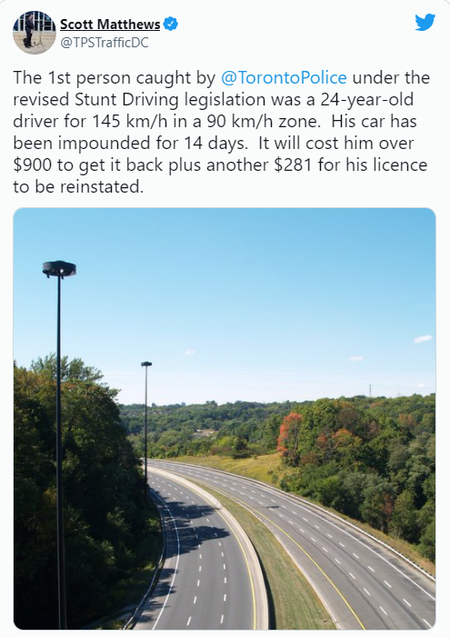 另一名 24 岁的司机在 90 公里/小时的区域内以 145 公里/小时的速度行驶。“他的车被扣押了 14 天。他将花费超过 900 美元才能取回它,另外还要花费 281 美元才能恢复他的执照,” 多伦多警察局负责人Scott Matthews说。