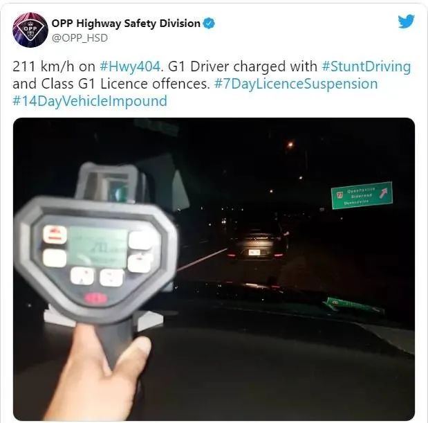 安省的一名 G1 司机最近在 404高速公路上以超速高达 100 公里/小时的速度被抓。