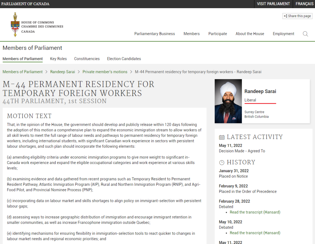 根据CIC News报道,联邦的一项议会动议(M-44)要求移民部长Sean Fraser公布一项最新计划:帮助临时居民加速成为永久居民。