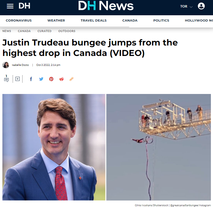 “你永远也不会知道在加拿大的蹦极台上能遇到谁!加拿大总理特鲁多带着他的儿子Xavier和女儿Ella-Grace来蹦极了,他们在这里体验到了奇妙的一跃。”