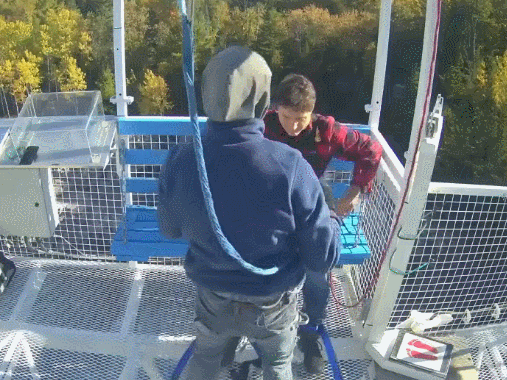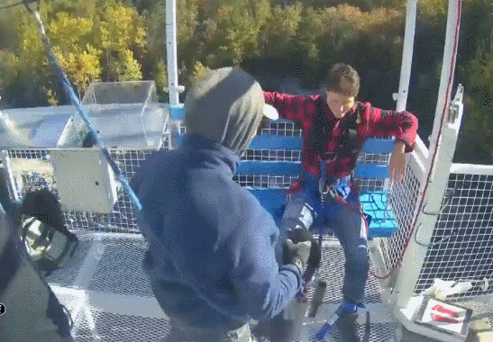 蹦极成功!就这样,在空中弹了几次之后,特鲁多又被带回到了平台。