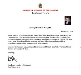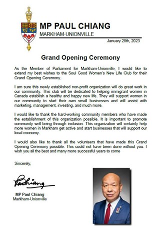 2023年1月28日,多伦多职业规划中心在盘石中心隆重举行“慧之灵”女性成长俱乐部(Soul Good Women Happy Life Club)开幕仪式。活动当天,多伦多职业规划中心学员、VIP嘉宾及身心成长商家等50多人欢聚一堂,共同见证了“慧之灵”女性成长俱乐部的成立。联邦国会议员董晗鹏(Han Dong)、国会议员蒋振宇(Paul Chiang)分别发来贺函。