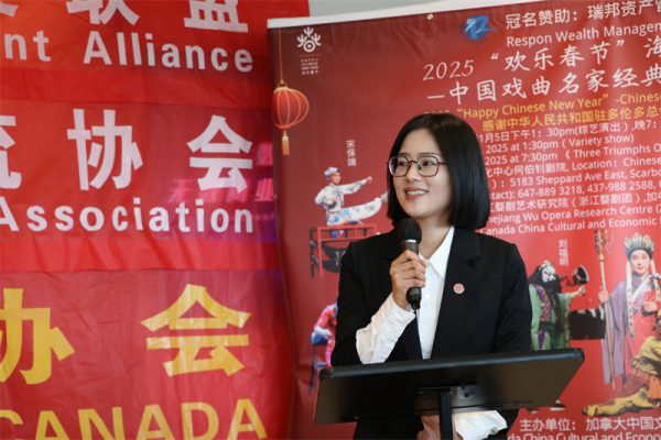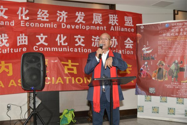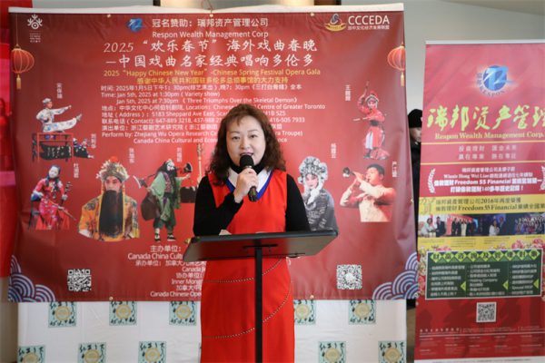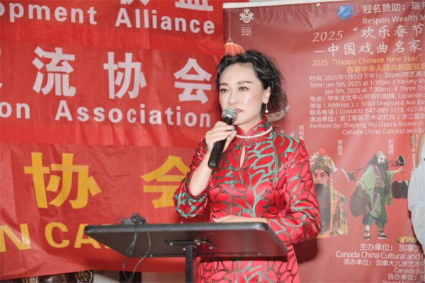 加拿大中国文化经济发展联盟主席Sophia Lian在演出前的欢迎酒会上首先致辞,欢迎政要嘉宾、社区各界、广大媒体及戏迷观众朋友的到来,介绍了浙江婺剧艺术研究院是中国对外文化交流的一张金名片。先后20余次登上央视春晚、新年戏曲晚会、亚洲文化嘉年华等高规格文艺演出的舞台。他们的足迹遍及世界五大洲60多个国家和地区,共计演出 300余场,观众人数约500万人,是最受海外观众欢迎的中国演出团体之一,预祝他们的演出圆满成功!同时,在新年到来之际,Sophia也代表联盟向加拿大的华人、华侨及祖籍国的父老乡亲恭祝新年快乐!向加拿大三级政府、中国政府驻加机构、各社区、社团致以最诚挚的新春问候!向参加此次演出的浙江婺剧艺术研究院表示衷心的感谢和敬意,并向所有参加演出的演职人员表示诚挚的感谢!特别感谢作为金融行业领头羊的冠名赞助商瑞邦资产管理公司的大力支持和慷慨捐助,感谢所有的赞助商的支持和帮助;感谢社区侨界及各大媒体长久以来的厚爱和支持,感谢所有义工的无私奉献。
