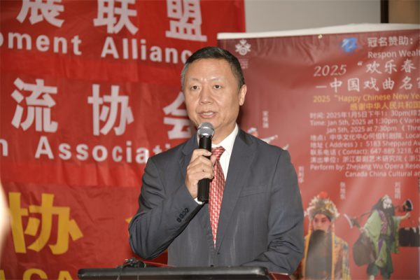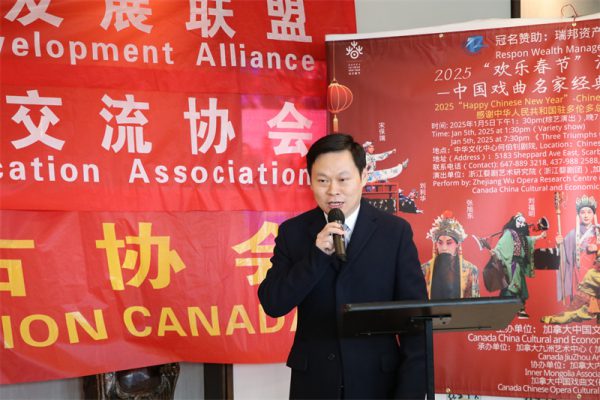 中国驻多伦多总领事罗伟东亲临晚场的演出现场致辞:他表示浙江婺剧艺术研究院连年登上央视春晚、新年戏曲晚会等舞台,积极投身于对外文化交流,十余年来参加全球“欢乐春节”品牌活动,相继出访五大洲66个国家和地区,展现出“根在农村、枝在城市、花开境外”的新景象。这次婺剧团克服万难、不辞辛劳,献上来自祖(籍)国家乡的新年问候,与加拿大当地戏曲爱好者以曲会友,丰富了加拿大多元文化,增进中加两国人民相互了解和友谊,践行全球文明倡议,有利于促进文明交流互鉴,推动构建人类命运共同体。他充分肯定了加中文化经济发展联盟多年来连续举办海外戏曲春晚,为中国戏曲艺术在海外的的传承、弘扬和发展做出积极贡献并借此机会向各位来宾表达了新年的祝福!