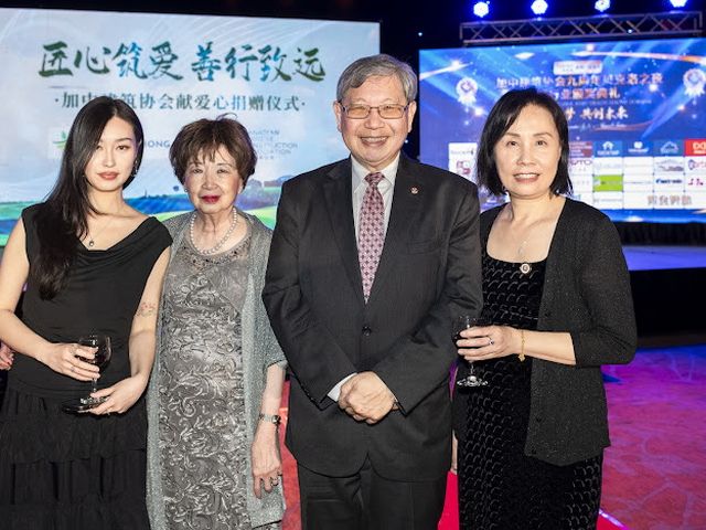 协会创会长Raymond Wan、荣誉会长李绍麟、会长Alex Huang、理事长Jason Pu和副会长Michael Mao参加捐赠仪式,颐康基金会总裁萧显扬,经理Cathy Zhou上台接收支票,列治文山副市长陈志辉、万锦第六区议员杨绮清、加中地产投资基金会会长孙志峰,Tridel副总裁陈桂祥共同见证了这一温情时刻。现场暖意融融,掌声如潮,每一份善款都承载着建筑人的深情厚谊,传递着对长者的关怀与祝福。