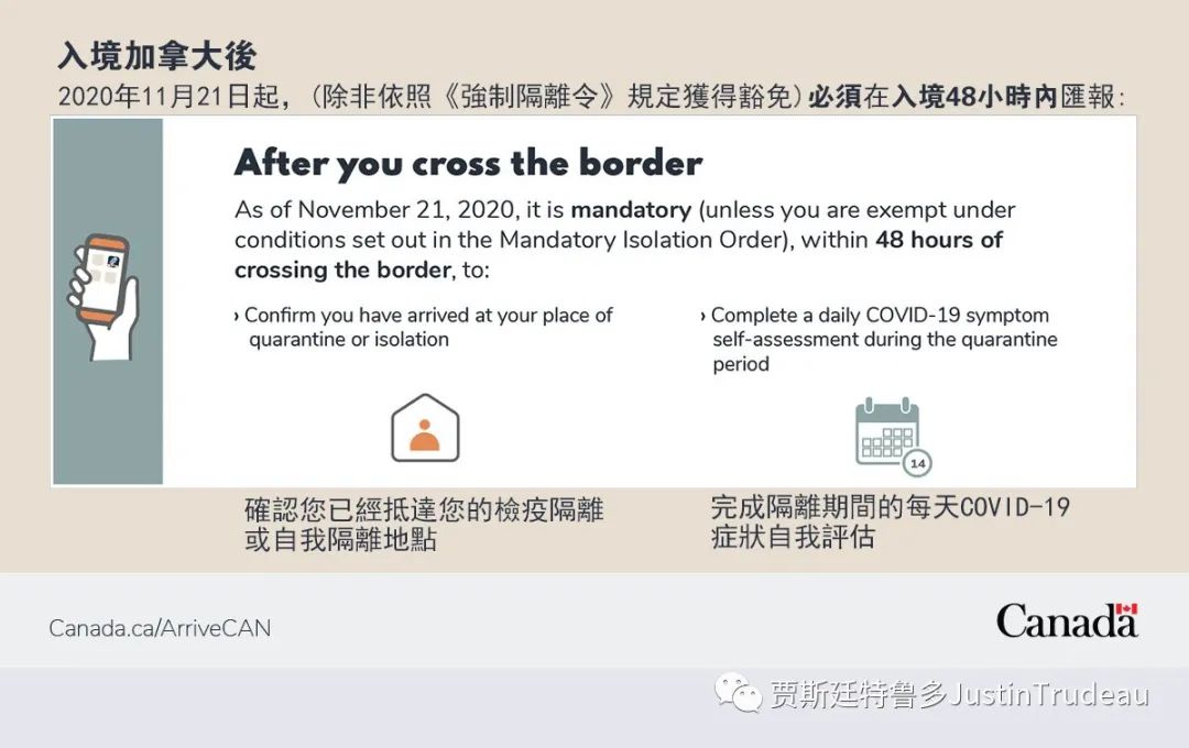 自2020年11月21日起,通过空中、陆路或海路方式进入加拿大的旅行者,除非依照《强制隔离令》规定的条件获得豁免,还要求他们在免疫隔离或自我隔离期间通过ArriveCAN或致电免费电话1-833-641- 0343申报。入境加拿大后的48小时内,旅行者必须确认他们已到达检疫或自我隔离地点,而被检疫隔离的人士必须在检疫隔离期内完成每日的COVID-19症状自我评估。