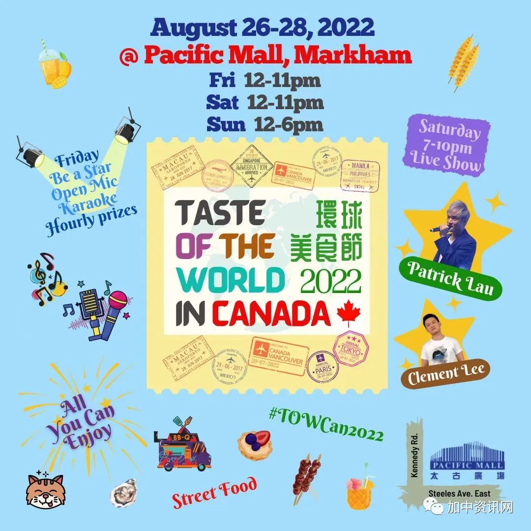 《環球美食節》於8月26至27日星期五六由中午12時起直至晚上11時開放,星期日由中午12時至傍晚時,免費入場。在萬錦市太古廣場北面和東側以及地下設有大量免費停車位。查詢詳情:venus2046@yahoo.com, 437-249-3799。