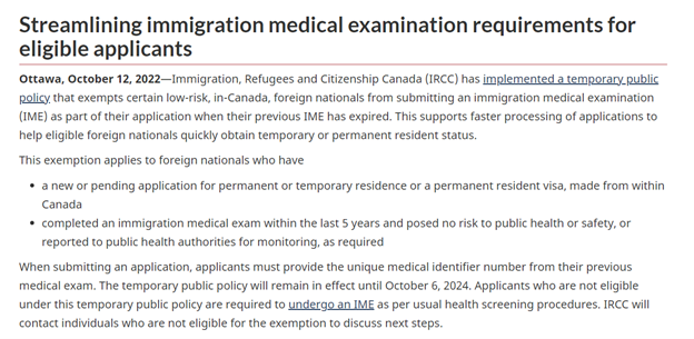 提交申请时,申请人必须提供上次体检的唯一医疗标识号(unique medical identifier number)。该临时公共政策将持续到2024年10月6日。