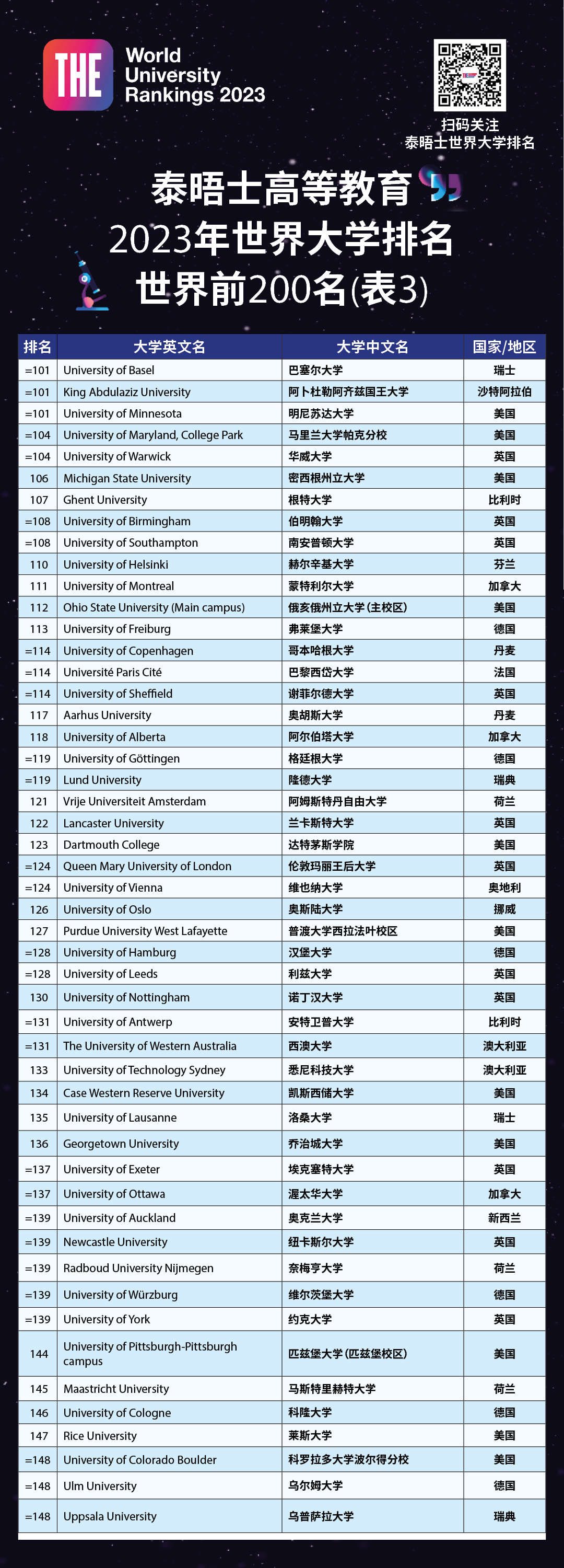 10月12日,目前全球四大权威大学排名之一的泰晤士高等教育(Times Higher Education) 发布《2023年泰晤士高等教育世界大学排名》。