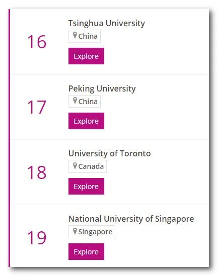 清华大学和北京大学分别是第16名、第17名。多伦多大学仅仅跟随,并排在康奈尔大学(20名),加州大学洛杉矶分校(21名)和伦敦大学(22名)前面。