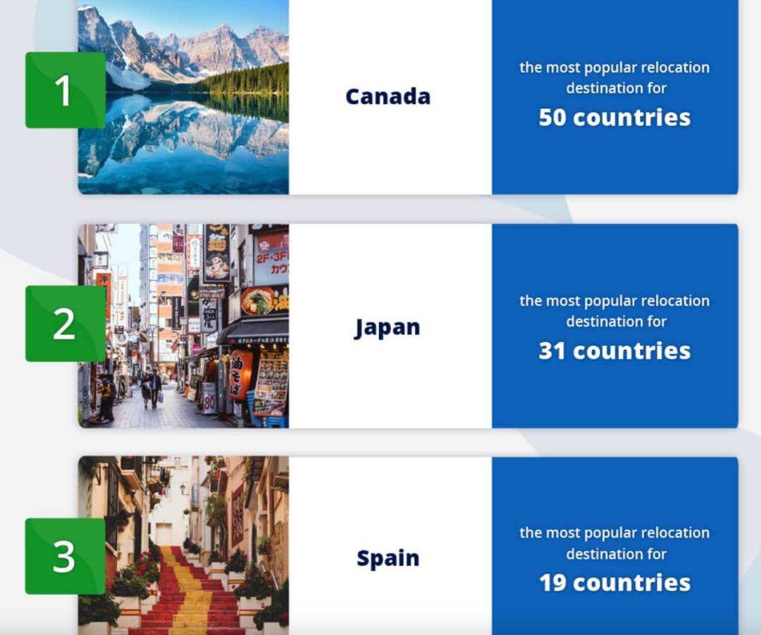 他们根据 Google 搜索数据年度关键词“搬迁”和“移居”绘制了一份清单,揭示了世界上最理想的移民目的地。其中,加拿大位居榜首,被认为是全球其他 50 个国家居民的梦想家园。排在第二、三位的则分别是日本和西班牙。
