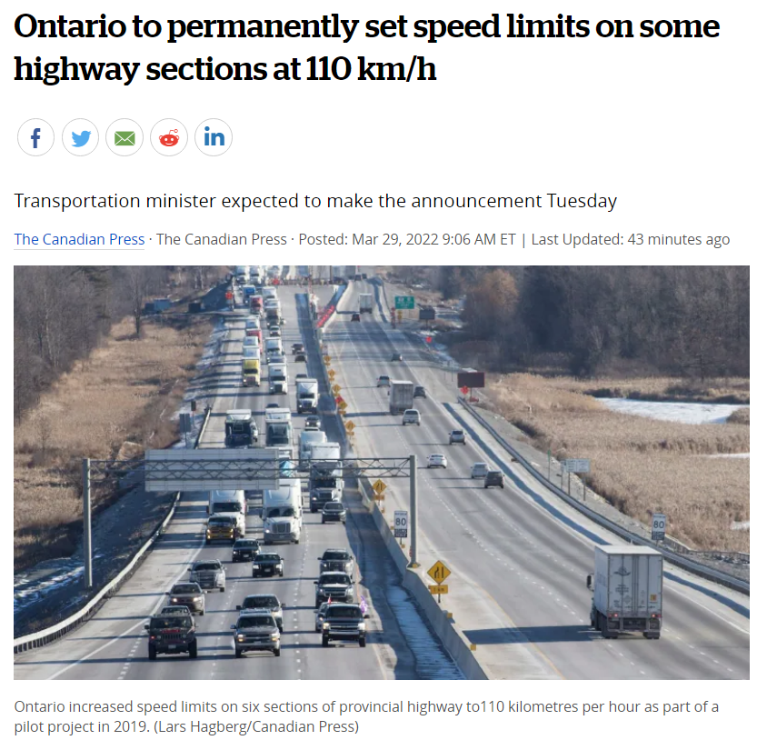 安省政府表示,自 2019 年以来,试点限速为 110km/小时的 6 个高速公路路段与限速为 100km/小时的类似高速公路路段速度和交通事故趋势相当。