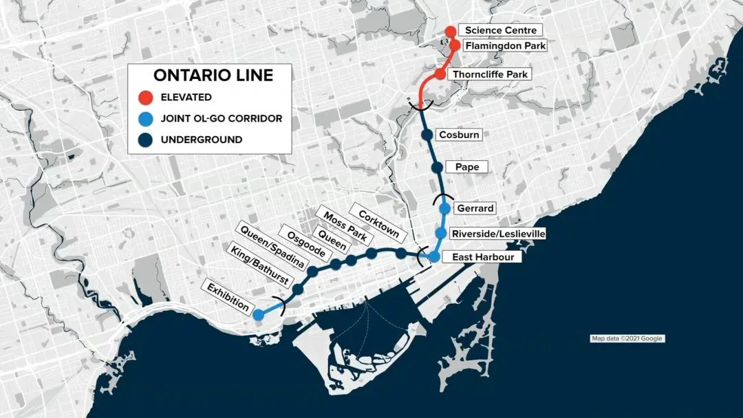 安大略线是福特政府的标志性交通建设项目,安大略线全长 15.6 公里,从Exhibition Place到Ontario Science Centre,沿路共设有15个车站。
