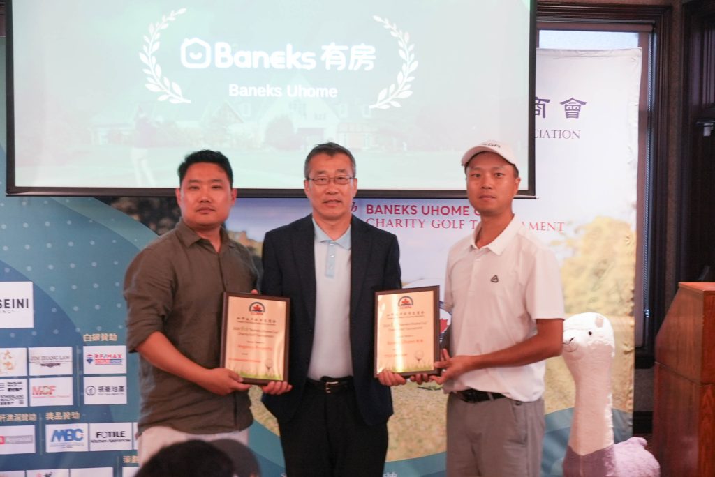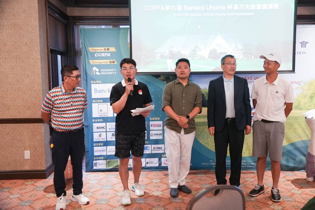 每届慈善高尔夫邀请赛的成功举办都离不开商会全体理事,各地产公司和房地产相关人士的努力及支持,特别是各赞助商的鼎力协助。张金鹏会长首先为本次活动的协办单位Regency Property 代表Samuel Wang 和冠名赞助Baneks Uhome联合创始人陈德胜颁发奖牌。其后,荣誉会长及前会长江邦固Banggu Jiang、前任会长孙志峰Steven Sun、前会长袁浩彬Herman Yuan为钻石赞助商Bossieni Living和Arkfield Development 颁发奖牌。