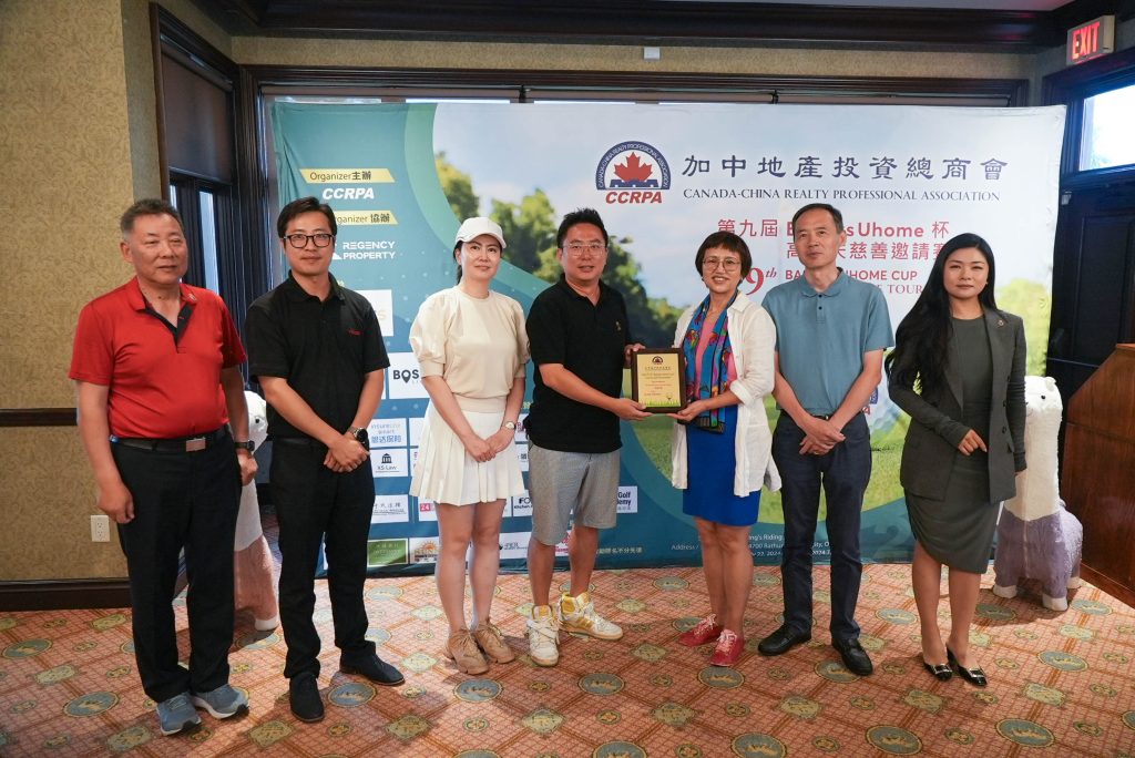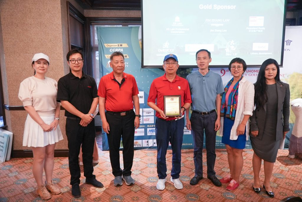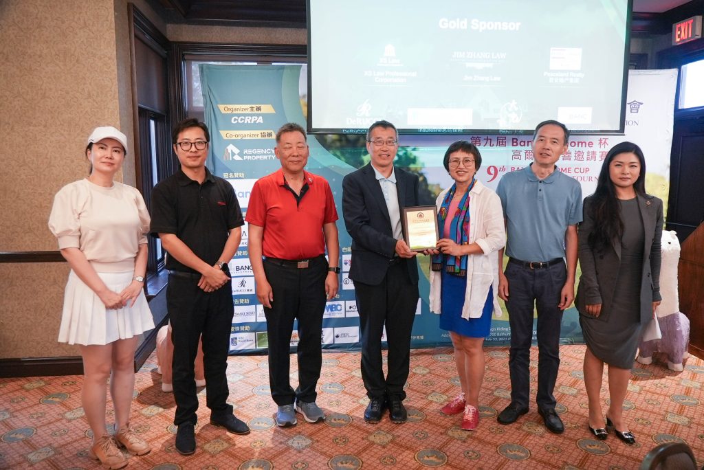 此外,常务副会长陈国强David Chen、秘书长陈虹Tina Chen、副会长肖焕立Harry Xiao、张夏景Bruce Zhang、杨浩林Nicholas Yang、袁杨朵儿Duoer Yuan和监事长佟羽Sandy Tong为黄金赞助商颁奖。本次活动的筹备组执行主席Harry Xiao 肖焕立、Duoer Yuan 袁杨朵儿则为友情赞助、礼品赞助、会务赞助和特殊贡献单位颁奖,以表感谢。黄金赞助单位分别是:君安地产集团、张金鹏律师所、孙鑫律师所、大虎餐厅、慕斯家俬、思达保险、Lebanc Development、万锦金融、瑞麦安家、领峯地产,以及一杆进洞赞助单位24 Appraisal。友情赞助单位是:阳光集团, 大伟表行、龙港和RBC。还有广告赞助单位R-YU LEGAL于戎伟律师顾问和舒适置业。礼品赞助单位是方太集团、Money Broker Canada 、B-Cure Laser Canada、So Golf高尔夫学院和阿德莱德营地度假村。以及策划赞助单位-传奇文化传媒,和特别贡献奖获得者Samuel Wang。