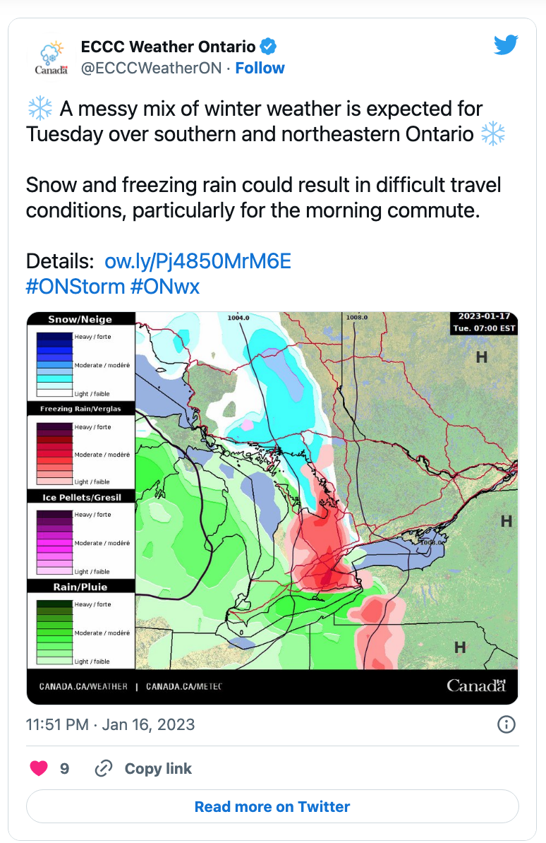 加中资讯网2023年1月17日讯 天气网络称:一股低气压在赶来安省的路上。从明天开始,冻雨和雪将轮番来袭,连下4天!一直下到周五!