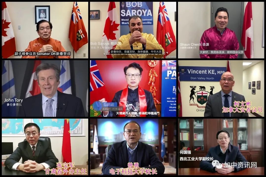 特鲁多总理、联邦参议员胡子修先生、国会议员Bob Saroya、 陈圣源先生、多伦多市长John Tory、省议员彭锦威、柯文彬、中国驻多伦多总领事韩涛、电子科大校长曾勇、西工大副校长何国强、甘肃省外事办主任张宝军等为晚会发来贺信和致辞。甘肃省侨联主席闫鹏勋、联谊联络处长谷云革先生以视频方式向旅加同胞拜年、恭贺新春。