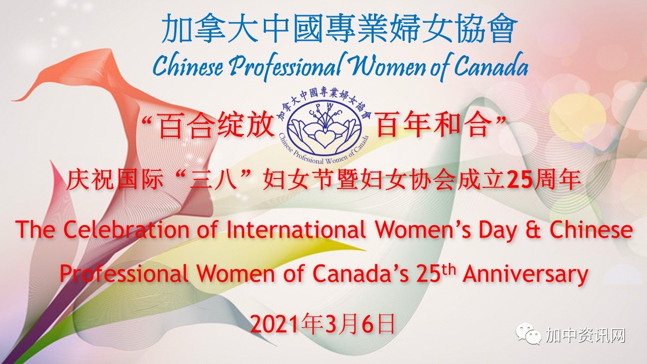 加拿大中国专业妇女协会将于今天2021年3月6日(星期六)举行国际三八妇女节暨协会 25周年“云”庆典活动,欢迎新老会员们和朋友们踊跃报名参加。