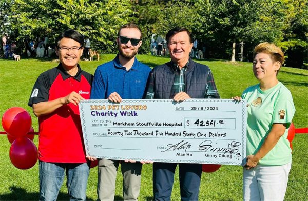 在Ginny Chung和何胡景区域议员签署大支票后,正式将其交给万锦市多福医院的代表Allen Bell和Matteo Paolucci,现场气氛热烈,掌声不断。所有的参与者和狗狗们进行了大合照,留下了这个难忘的瞬间。