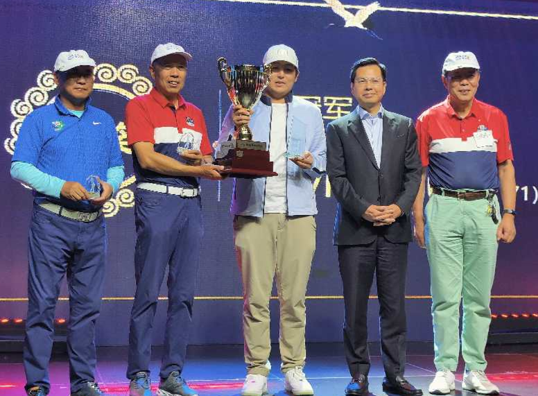 后起之秀,多伦多艾琳黛尔中学 Ovide Sun (中)以总杆数负一的成绩获冠军!陈平安(左二),倪晓兵(左一)分别获得第二和第三名。周建成博士及王培忠博士为获奖者颁奖