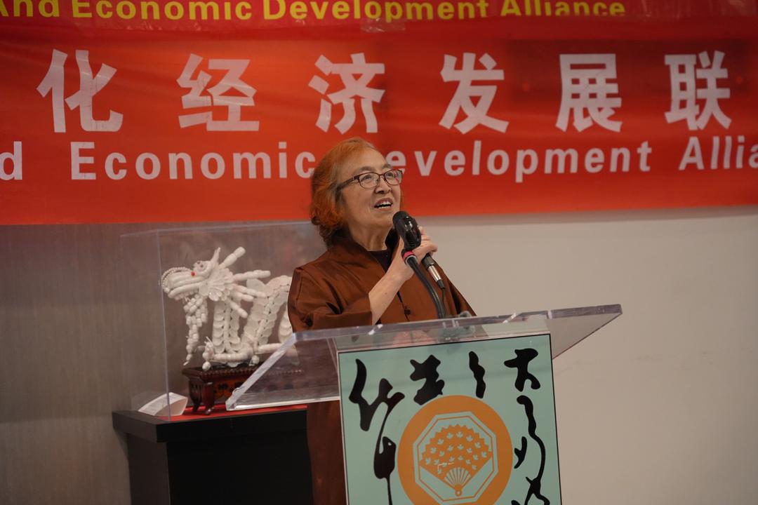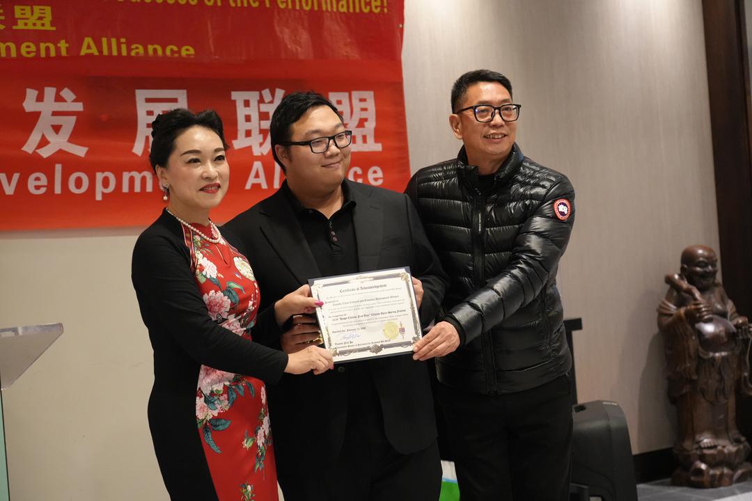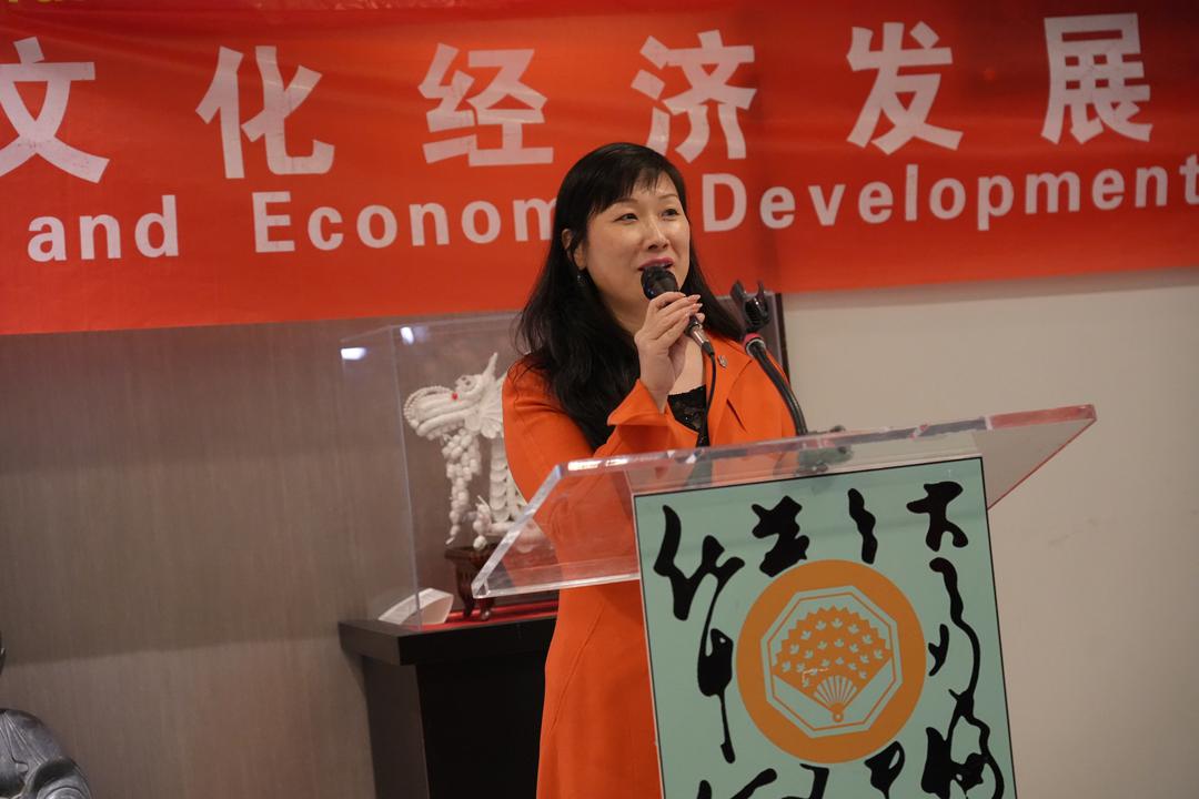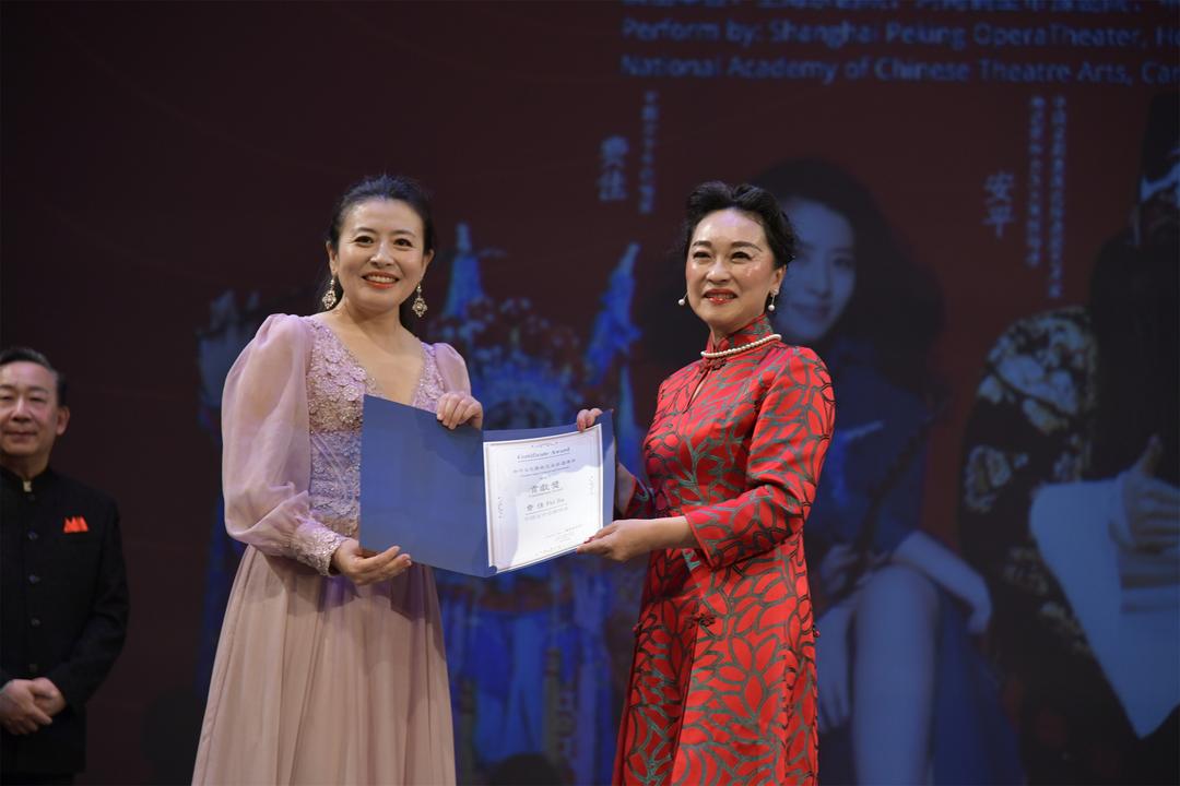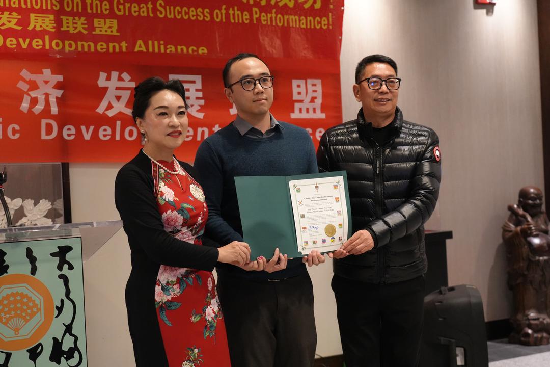 Sophia Lian代表加中文化经济发展联盟分别向安平老师和费佳老师颁发了"加中文化艺术交流非遗传𠄘贡献奖"。