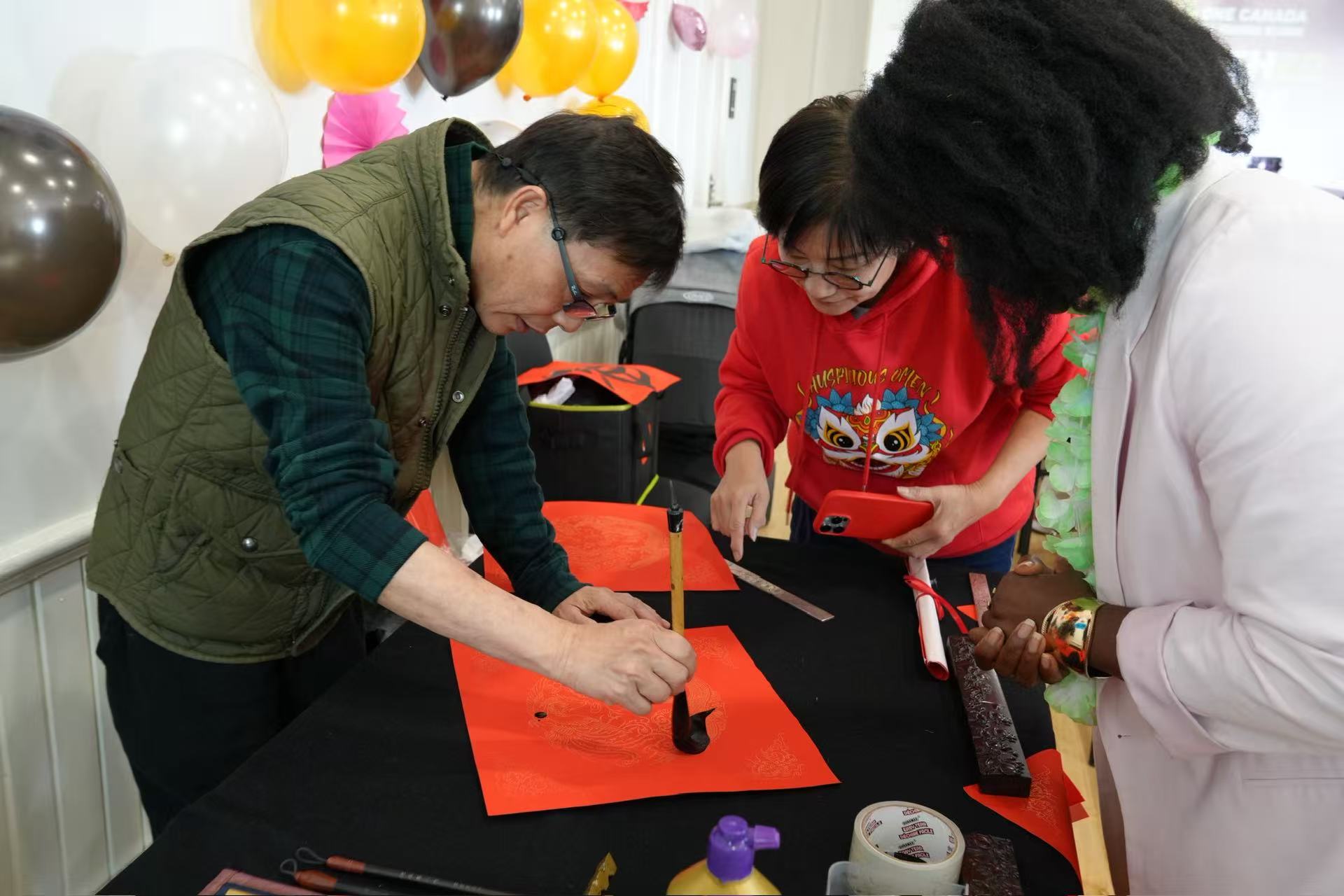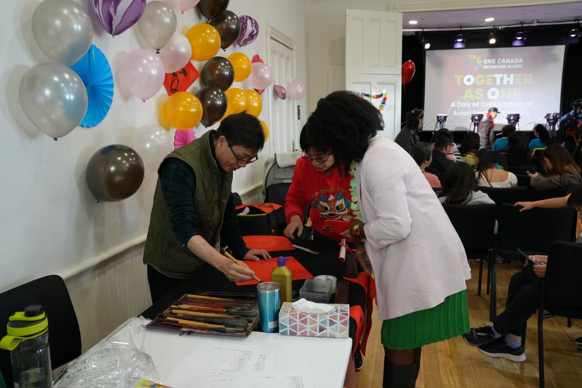 应邀出席活动的奥罗拉黑人协会创始人菲奥娜向来自中国香港的国家一级书法家、大西洋书法协会副会长张国昇讨要墨宝(主办方图片)