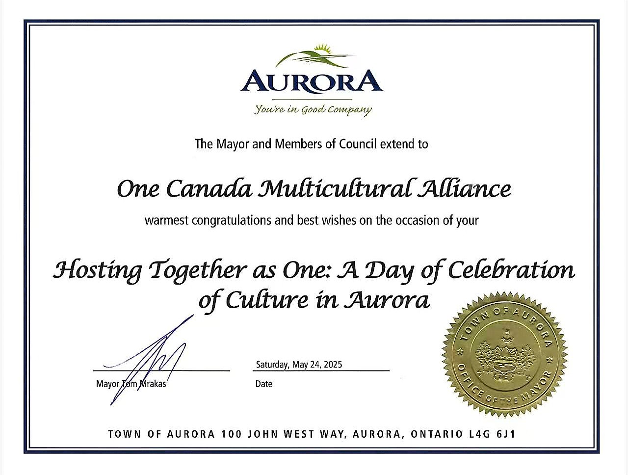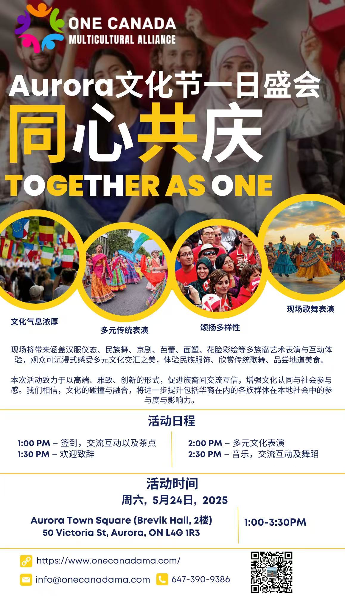 【One Canada多元文化联盟】举办的这次活动,宛如一朵绚丽的传统与现代、多族裔和合与共的花朵,盛开于春意盎然、夏意初萌的奥罗拉市。