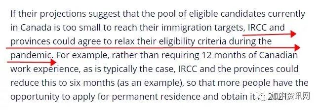 如果目前境内的合格申请人数太少导致无法实现起移民目标,IRCC和各省移民部或将同意在疫情期间临时放宽标准。例如,将12个月的加拿大工作经验要求减少至6个月,从而使更多人有机会在2021年申请并获得PR。