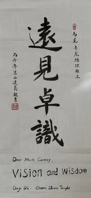 达义大和尚将亲手书写的墨宝“远见卓识”, 赠予卡尼总理