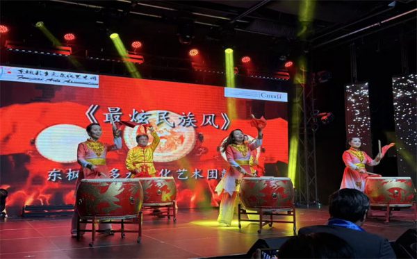 东枫彩艺术团震撼大鼓开场舞《最炫民族风》中隆重开启帷幕。