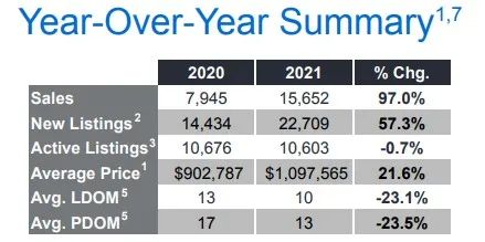 4月13日,BC省地产协会(BCREA)发布2021年3月房屋成交数据显示,BC省住宅成交套数达到15073,同比2020年3月上涨123.3%。成交总金额达到143亿加元,同比上涨168.9%;成交均价达到94.77万加元,同比暴涨20.4%。大温地区房价以11.3%的涨幅垫底,现均价为1,201,858加元。