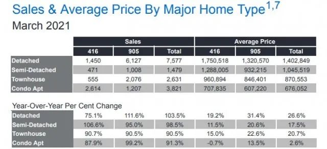 从TRREB提供的上表可见,独立屋不仅是今年3月份市场上的抢手货,而且价格涨幅也最大:同比上涨26.6%,涨到 $1,402,849,其中416地区超过175万,905地区132万。