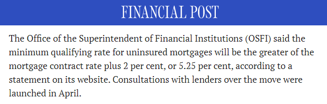 据财经邮报(Financial Post)报道,OSFI确认更严格的抵押压力测试将于6月1日生效。无保险房贷的最低合格率将加上2%或为5.25%(以较高者为准)。