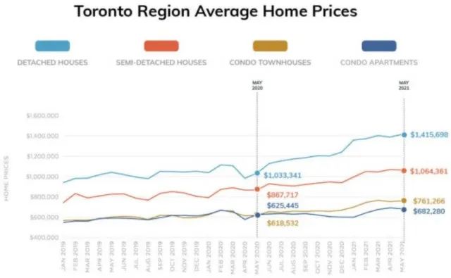 根据地产局提供的数据,5月份GTA地区独立屋价格涨幅颇大,多伦多东面杜兰区(Durham)均价首次越过百万大关,目前GTA五大区的独立屋价格均超百万。
