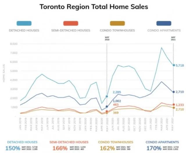 从多伦多地产网站Zoocasa提供的下图可以看出,不仅是独立屋,而且其它类型的物业交易量均比4月和3月份显著下降: