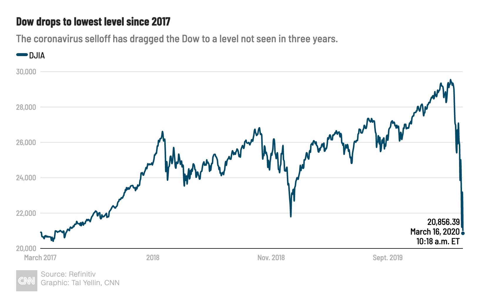 加中资讯网3月16日讯 今天(3月16日)上午,美国股市三大指数集体低开,自3月9日第一次熔断以来,八天内第三次触发熔断机制。