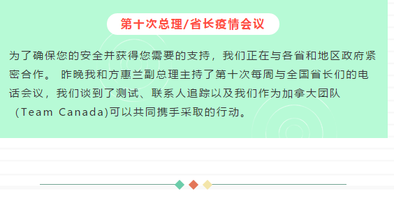 总理和全国省长们均重申,他们致力于通过加拿大团队的努力、共同应对COVID-19疫情的承诺。加拿大联邦政府将继续采取全政府、全方位和协调的方式来应对COVID-19疫情。