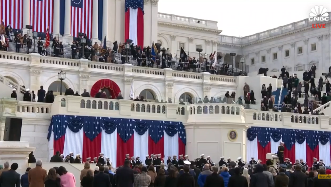 11点15分,典礼开始。海军陆战队军乐团演奏传统军乐,欢迎当选总统拜登、当选副总统贺锦丽等入场。