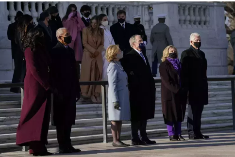 就职仪式结束后,拜登和贺锦丽在华盛顿郊外的阿灵顿国家公墓的无名烈士墓参加敬献花圈仪式,克林顿夫妇、奥巴马夫妇、小布什夫妇陪同。