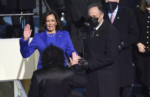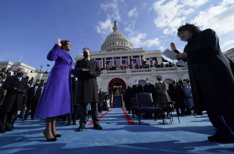 之后,副总统贺锦l丽在大法官索托玛约见证下宣誓就职,成为美国历史上首位女性副总统。