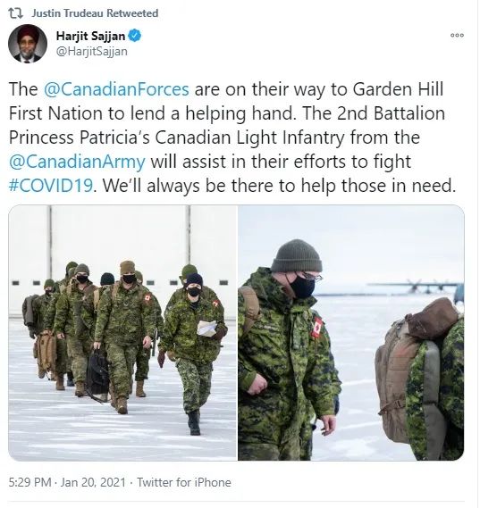 ¼ÓÄôóÎä×°²¿¶ÓÕýÔÚ¸ÏÍùÖ§Ô®Garden HillµÚÒ»Ãñ×åµÄÕ÷;ÉÏ¡£¼Ó¹ú½¾üµÄÅå´äÎ÷櫹«Ö÷Çá²½±øµÚ¶þÓªµÄÊ¿±øÃǽ«°ïÖúµ±µØÃñÖÚ¿¹»÷COVID-19ÒßÇéµÄÐж¯¡£µ±ÃñÖÚÐèÒª°ïÖúʱ£¬ÎÒÃÇÒ»¶¨»áÀ´µ½¡£