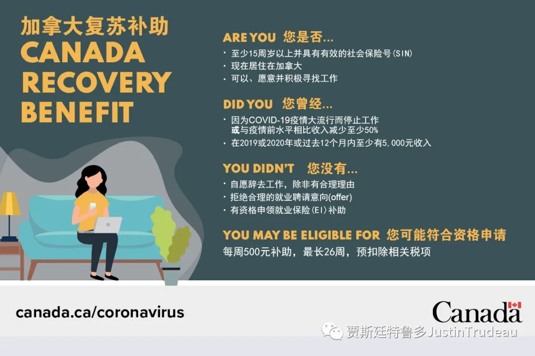👉加拿大复苏补助(Canada Recovery Benefit, CRB):如果您直接遭受COVID-19疫情的影响,但您是自雇人士或没有资格获得就业保险(EI),则可以使用此服务。此项目可为您提供每周500加元的补助,最长26周。更多信息在这里:https://bit.ly/2JfdecW