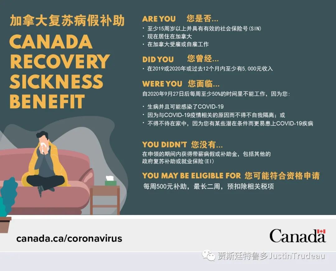 👉加拿大复苏病假补助(Canada Recovery Sickness Benefit, CRSB):如果您因为生病或因COVID-19疫情而需要自我隔离而无法工作,则可以使用这一计划。此处更多内容:https://bit.ly/37gvqeg
