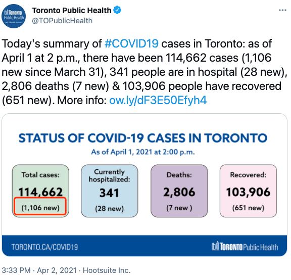 4月2日多伦多市新增1,106,其中住院341人(新增28人),死亡新增7人,死亡总数达2,806人。