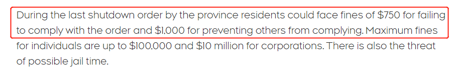 根据上一次封锁令规定,居民因未能遵守法规会面临$750罚款,因阻止他人遵守该命令会被罚$1000。如果情节严重,那么个人的最高罚款额为$10万加币,对公司最高罚款额为$1000万,还可能坐牢。