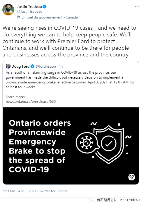 “我们看到COVID-19的新增病例正在上升——我们需要尽一切努力来帮助确保民众的安全。我们将继续与福特省长携手合作,保护安省人民,我们将继续与全省乃至全国的民众和工商业同在,为他们提供支持。”