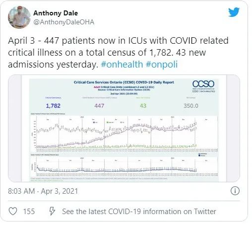 安省医院协会主席Anthony Dale发推特表示,全省ICU人数达到顶峰447人,周五一天ICU就新增43例。